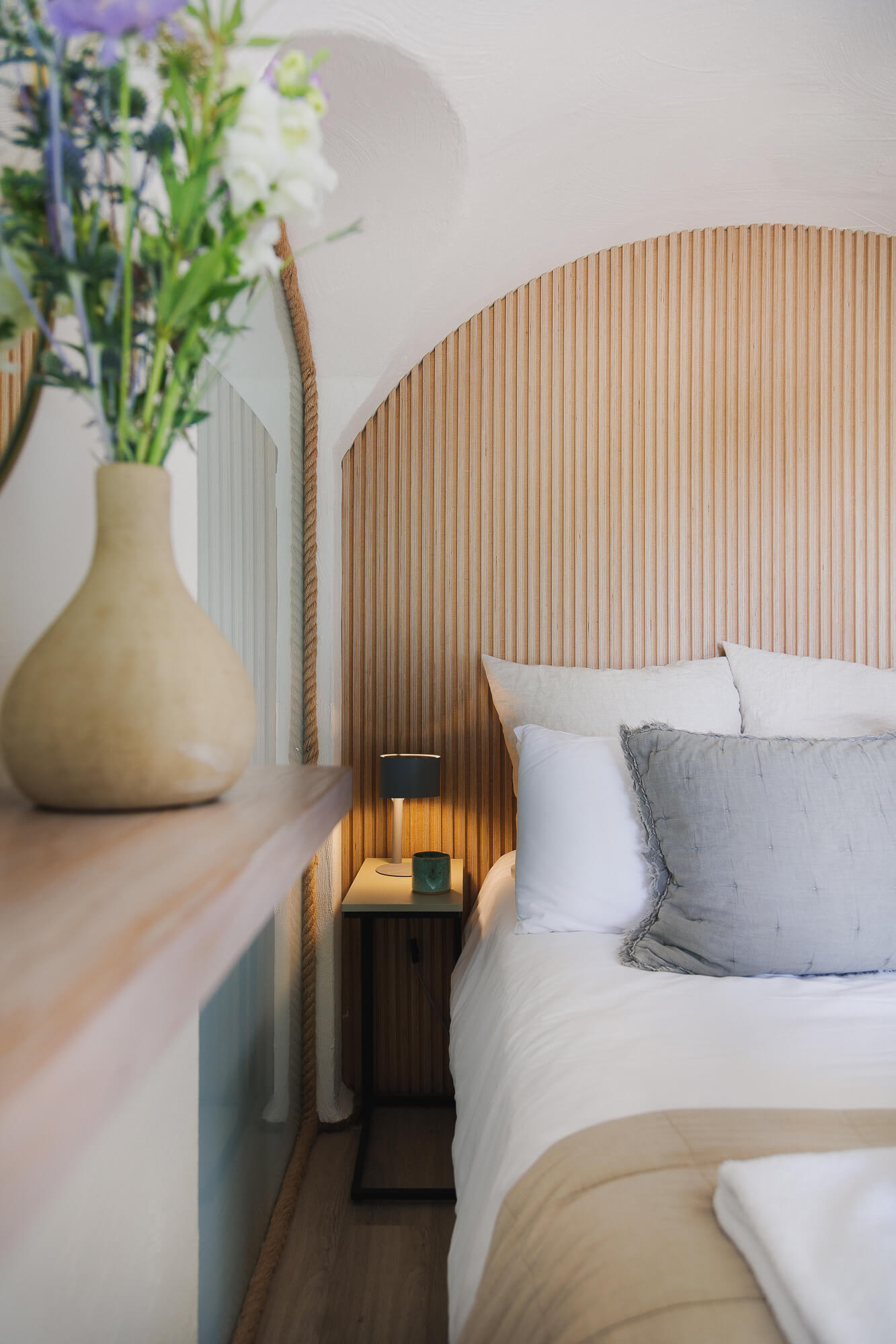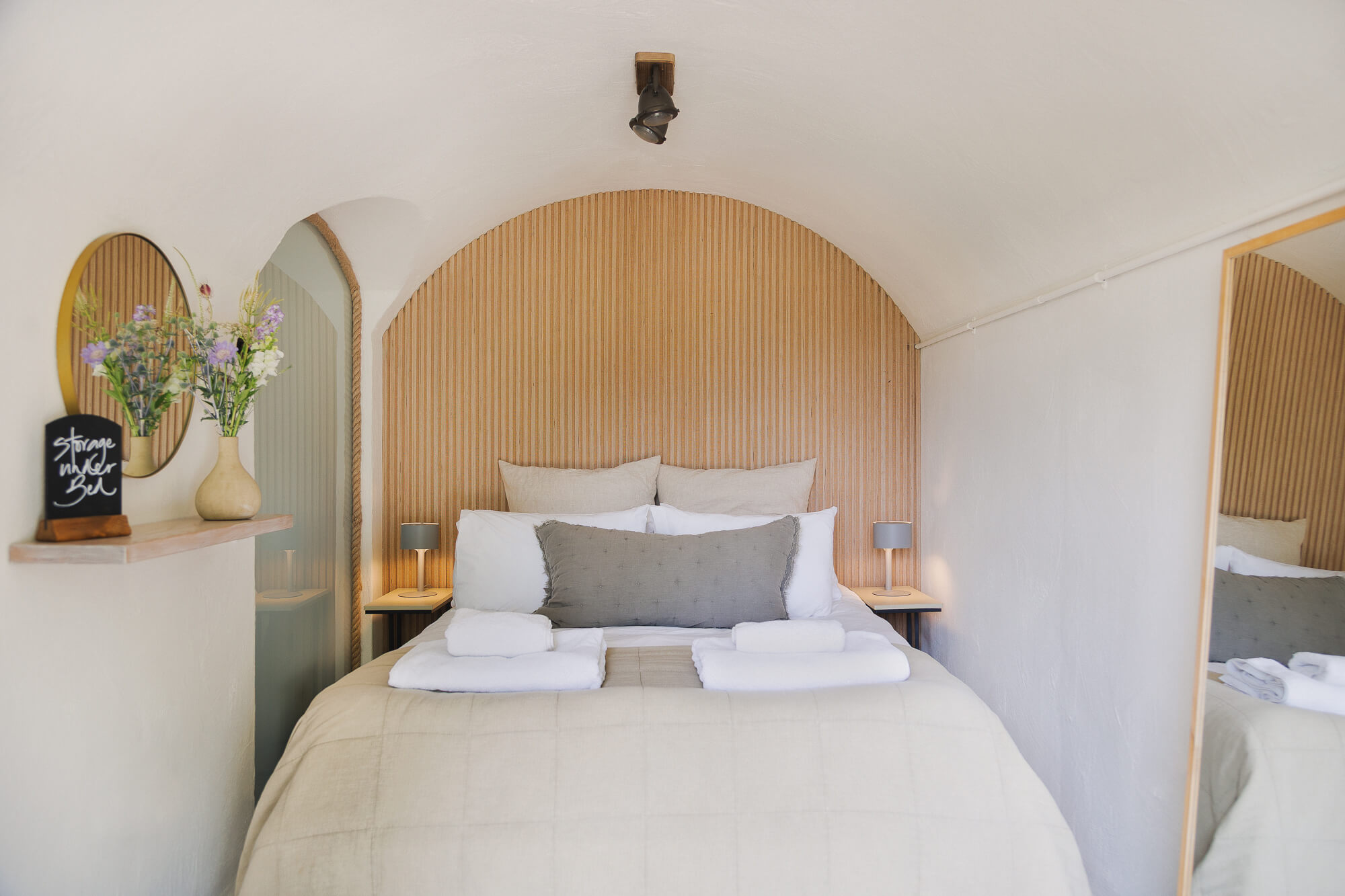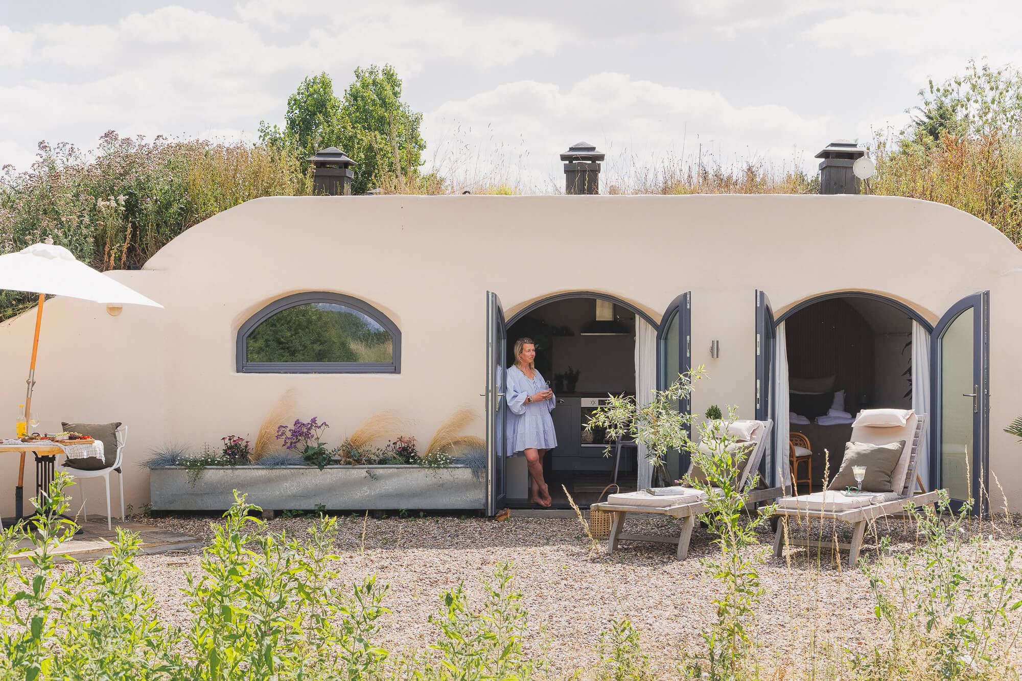 From the outside, it feels like part of the hillside. Step through the arched doors and you’ll find a fully equipped, thoughtfully designed interior: kitchen, living area and bathroom, all shaped by the vaulted concrete structure that keeps temperatures steady year-round.