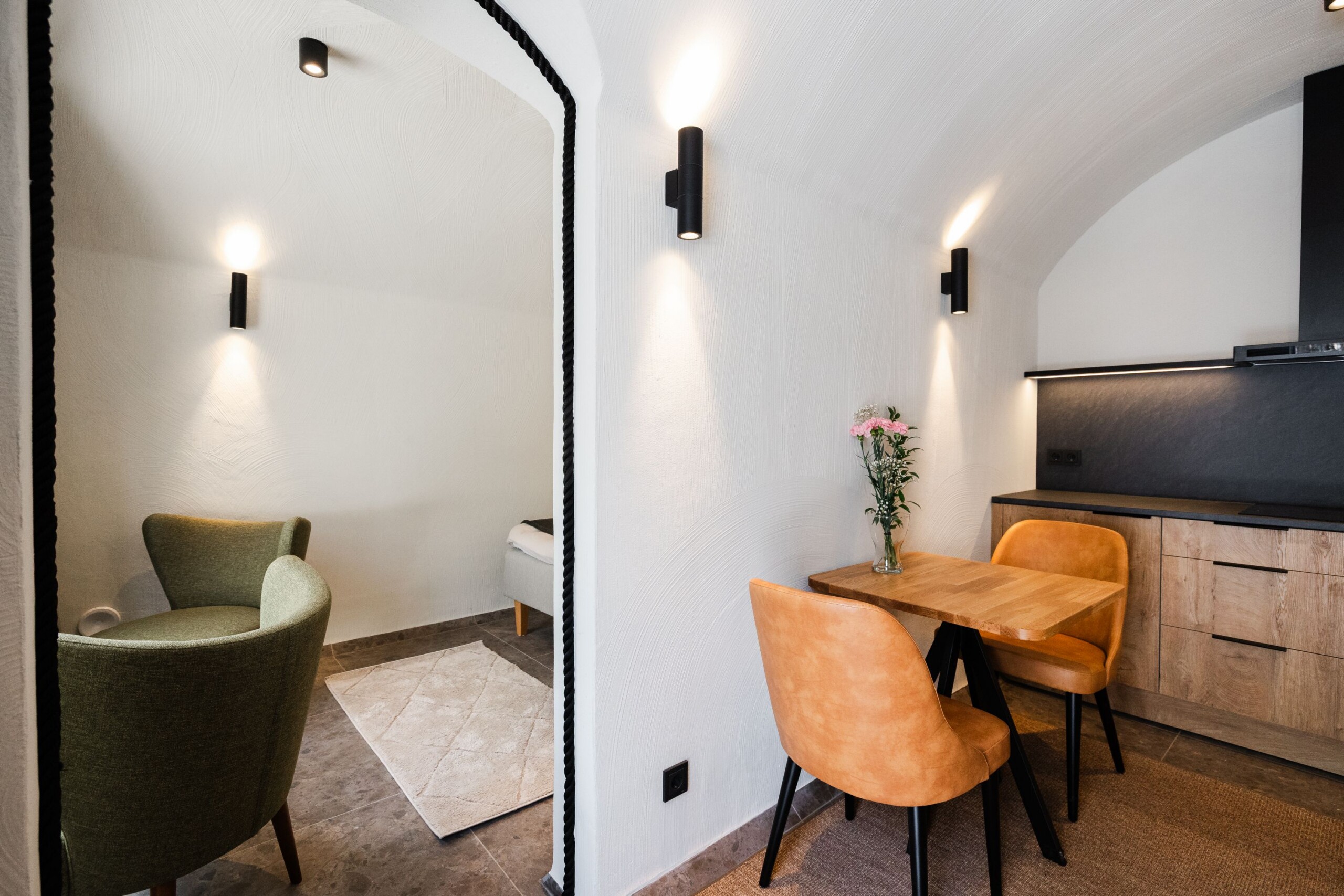 From the outside, it feels like part of the hillside. Step through the arched doors and you’ll find a fully equipped, thoughtfully designed interior: kitchen, living area and bathroom, all shaped by the vaulted concrete structure that keeps temperatures steady year-round.