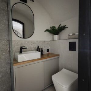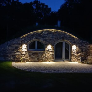 From the outside, it feels like part of the hillside. Step through the arched doors and you’ll find a fully equipped, thoughtfully designed interior: kitchen, living area and bathroom, all shaped by the vaulted concrete structure that keeps temperatures steady year-round.